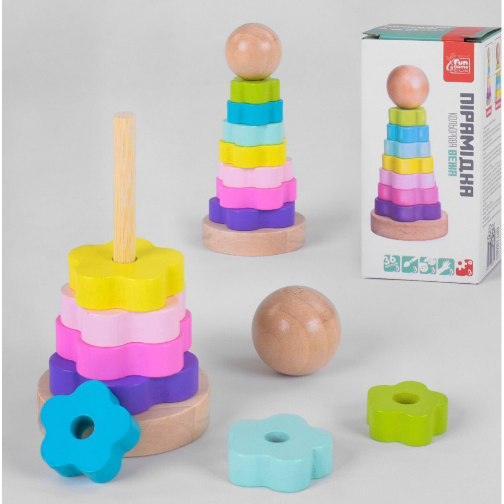 Іграшка складається з основи та 6 кілець, які відрізняються за розміром та кольором. Верхівку пірамідки прикрашає кулька. Під час гри дитина розвиває логічне мислення та дрібну моторику рук, вчиться порівнювати розміри та знайомиться з кольорами.
