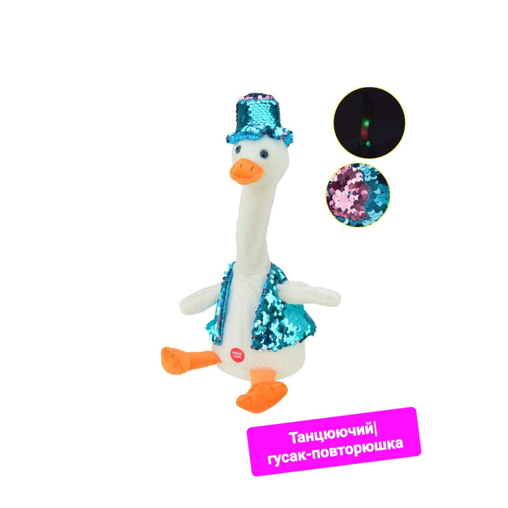 Плюшевий танцюючий Гусак стане розвагою не лише для дітей, але й для дорослих. Весела музика та танці підходять для створення приємної атмосфери та для вечірок. При одному погляді на іграшку вона вже викликає позитивні емоції, а також посмішку на обличчі. Записуючий пристрій у гусі запише будь-який ваш вислів, який ви скажете поряд з ним, він повторить ваші слова дуже смішним голосом і витонченим танцем. Особливості іграшки Гусак: іграшка гарна для дошкільного виховання, оскільки гусак танцює в ритмі, привертаючи увагу дітей та запрошуючи їх до гри; різноманітність функцій забезпечить тривалий інтерес малюків до неї; може бути чудовим подарунком не лише дітям, але й дорослим, оскільки весела музика та танці дуже підходять для створення приємної атмосфери.
