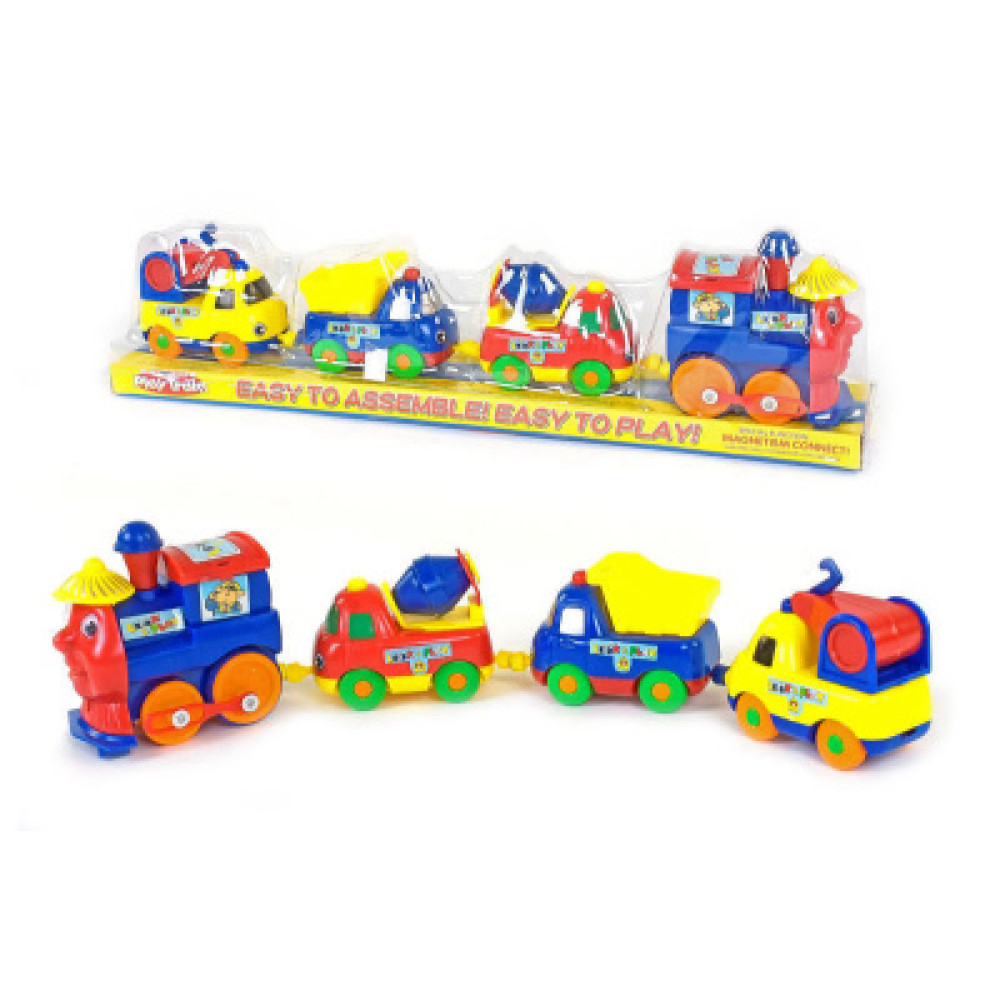 Паровозик (+3 машинки, з'єднані між собою магнітами) працює від однієї батарейки, під слюдою 34*6*9 см