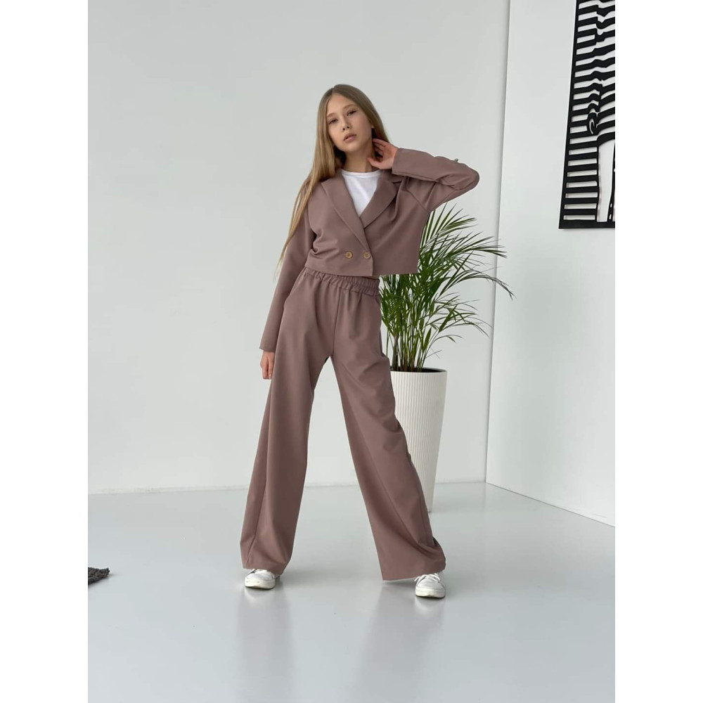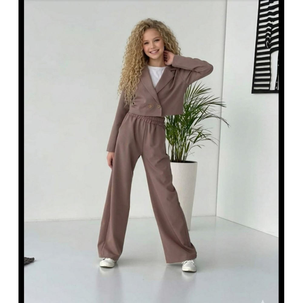 Моднявий костюмчик двійка,пошитий із тіару,не мнеться і гарно тримає форму. Талія на штанях на резинці,гарно тянеться. Піджачок застібається на два гудзичка.